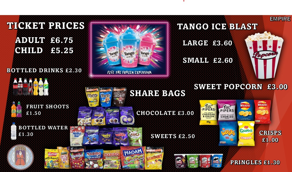 Coke, Diet Coke, Coke Zero, Orange Fanta, Lemon Fanta, Dr Pepper, Sprite, Still Water